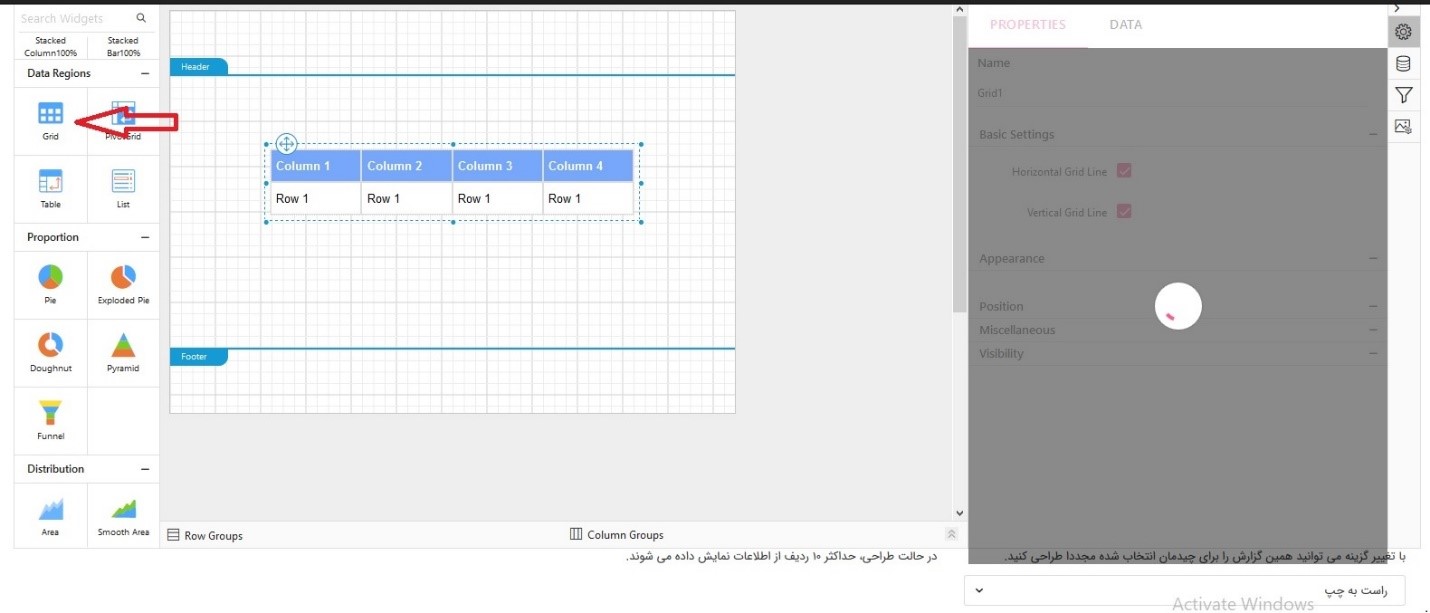 برای اعمال تغییرات کافیست روی گرید کلیک کرده در تب Properties روی گزینه Properties کلیک کنید. به این ترتیب کلیه خصوصیات گرید انتخاب