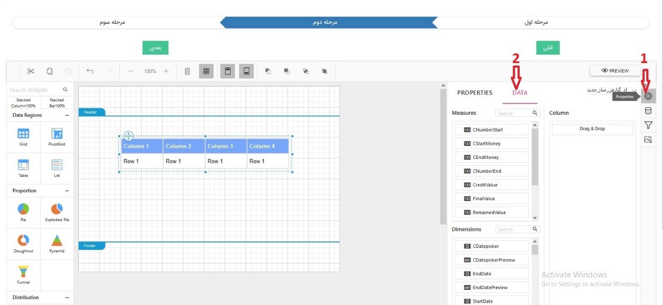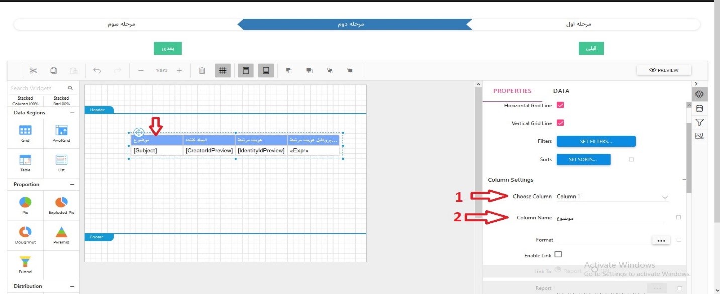 به عنوان مثال برای تغییر عنوان ستون ها کافیست در بخش Column Setting ، از گزینه (1) ChooseColumn برای انتخاب ستون مورد نظر و در بخش پایین آن (2) نام مورد نظر را وارد کنیم.