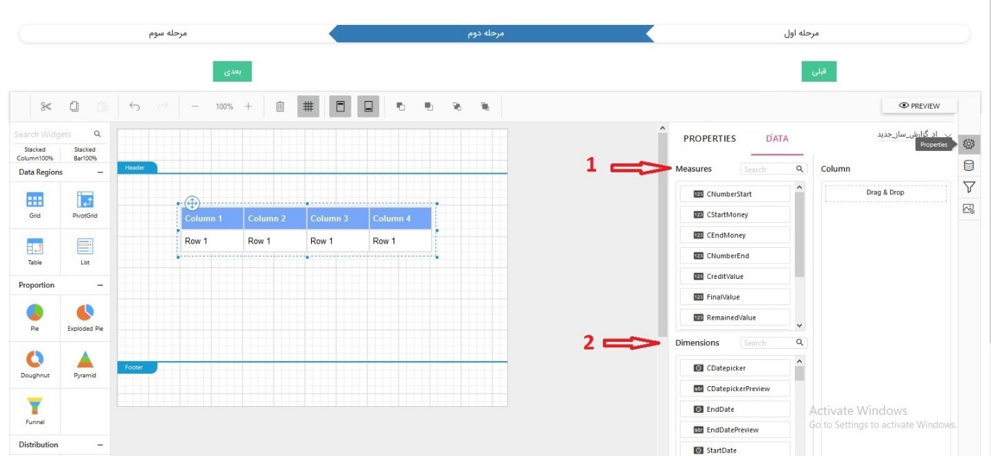 پس از انتخاب فیلد های مورد نظر برای گزارش گیری از تب