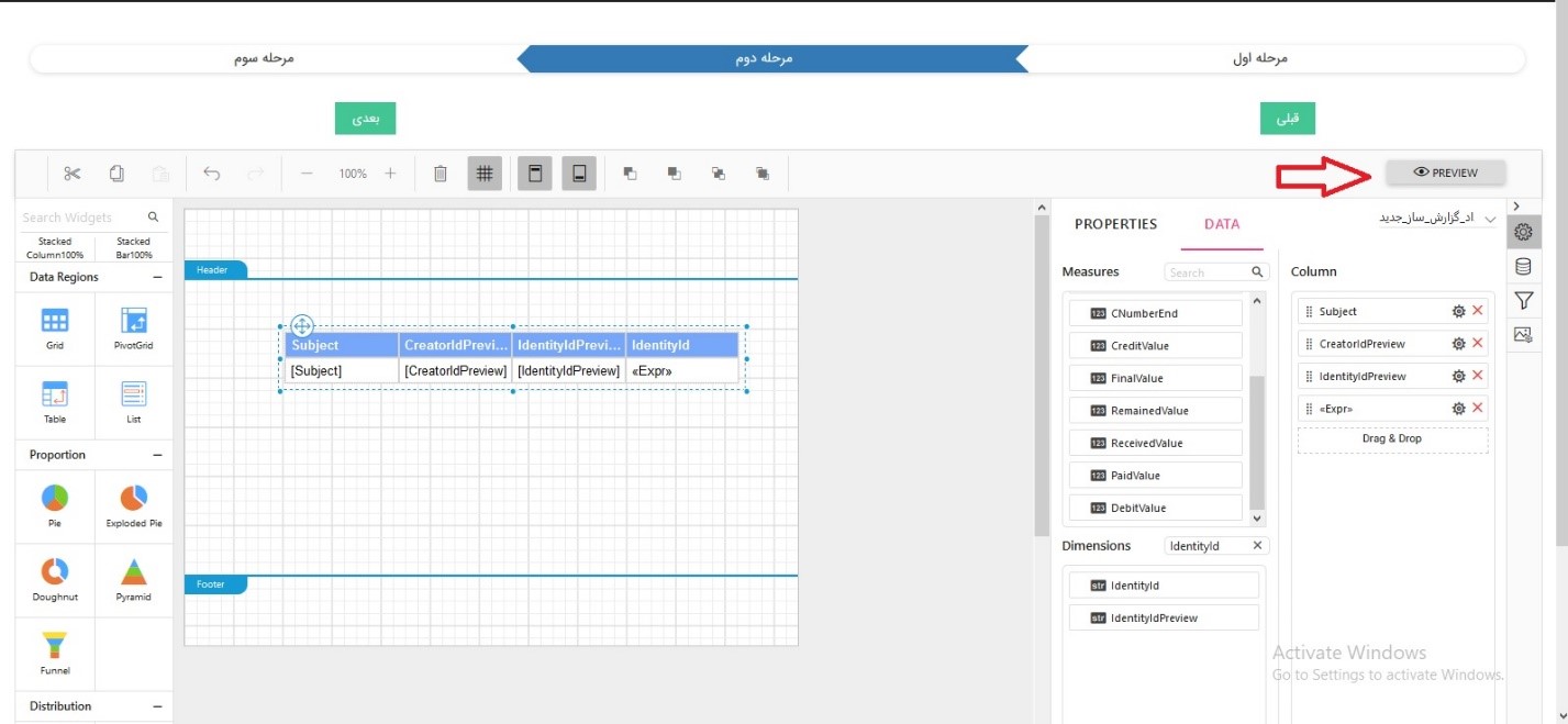 برای مشاهده خروجی گزارش طراحی شده از گزینهPreview استفاده کنید. قابل ذکر است که در حالت طراحی زمانی که روی دکمه Preview کلیک میکنید فقط 10 رکورد از خروجی مورد نظر را مشاهده خواهید کرد. ولی در زمان اجرای گزارش، خروجی های کامل را در اختیار خواهید داشت.