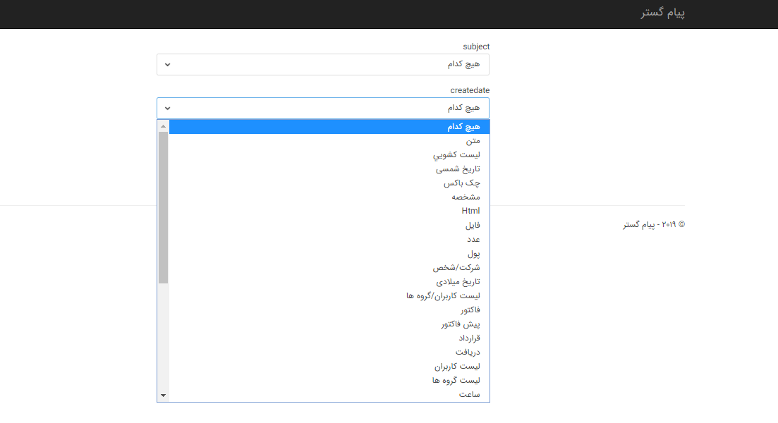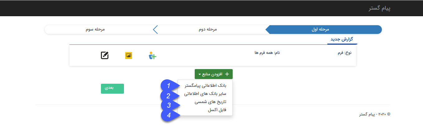 نکته : در صورت این که بر روی گزارش پارامتر تعریف کرده باشید با کلیک بر روی دکمه بعدی نوع فیلد را از انواع فیلد های موجود در نرم افزار پیامگستر خود انتخاب کنید .