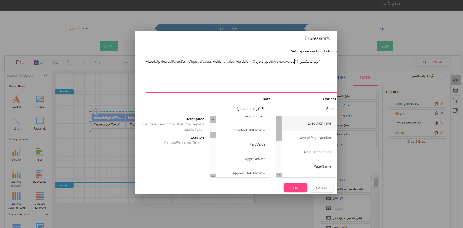 در صفحات لیست با کلیک روی دکمه مدیریت گزارش ها و بعد انتخاب یکی از گزارش های از قبل ساخته شده، این امکان وجود دارد که این لیست نیز به عنوان یک منبع داده ای به گزارش مورد نظر افزوده شود. این داده ها در بخش Expression طراحی گزارش و در بخش Date در اختیار قرار می گیرند.