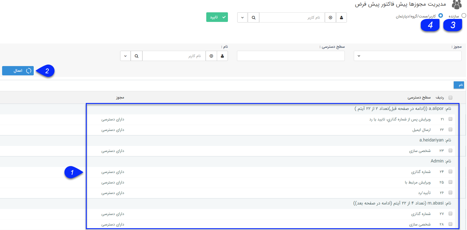 4 . برای مشاهده و ویرایش مجوزها و سطح دسترسی یک کاربر/گروه/سمت/دپارتمان مشخص به این آیتم، نام کاربر/گروه/سمت/دپارتمان مورد نظر خود را وارد کرده و روی دکمه تایید کلیک کنید.